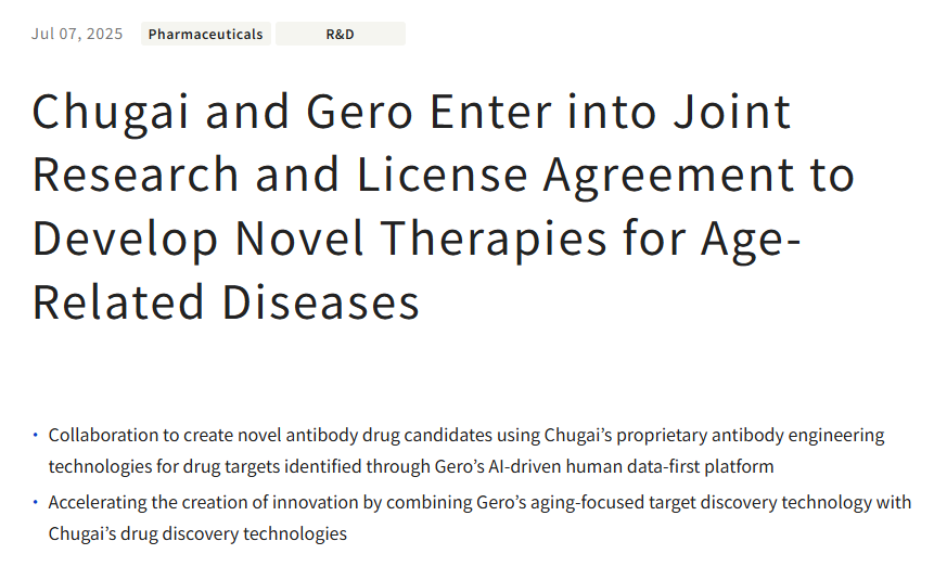 7 月 7 日 ,中外制药株式会社(罗氏控股的日本公司)与新加坡生物技术公司Gero PTE. LTD.(以下简称“Gero”)共同宣布,双方已达成联合研究和许可协议,旨在共同开发针对衰老相关疾病的新型疗法。